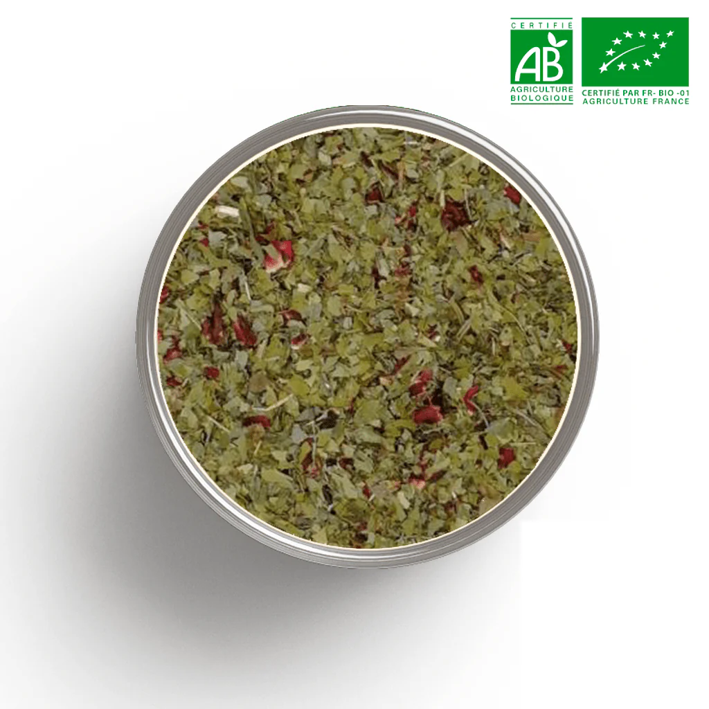 Maté vert feuille coupée, hibiscus fleur coupée, menthe nanah feuille coupée, myrtille feuille coupée, CBD (10 %)